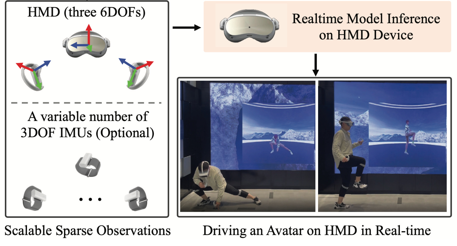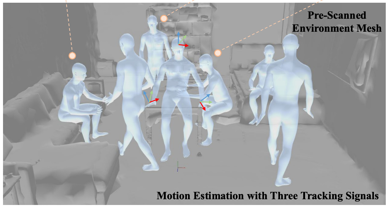 We propose EnvPoser, a two-stage method using sparse tracking signals and pre-scanned environment from VR devices to perform full-body motion estimation and handle the multi-hypothesis nature with uncertainty-aware and environmental constraint integration. |