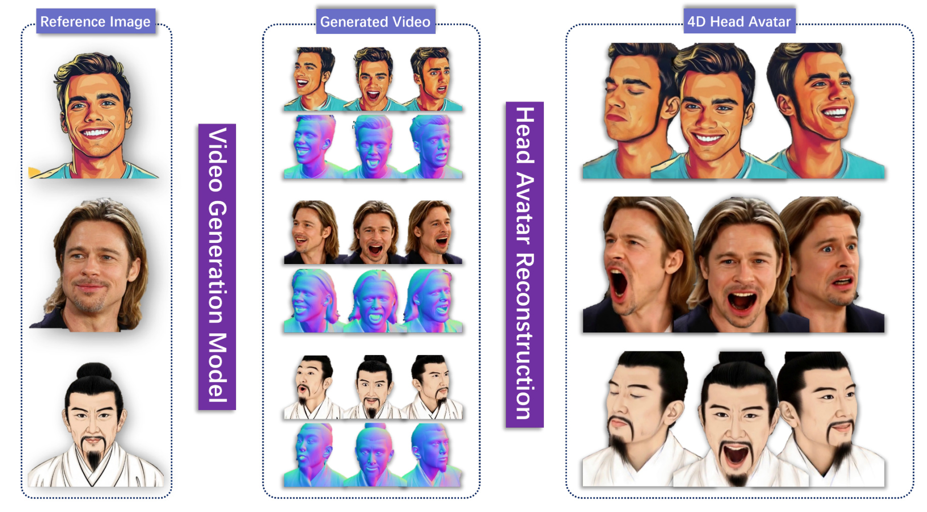 We present RePerformer, a Gaussian-based representation for high-fidelity volumetric video playback and re-performance. Via Morton-based parameterization, our method enables efficient rendering. A semantic-aware alignment module and deformation transfer enhance realistic motion re-performance. |