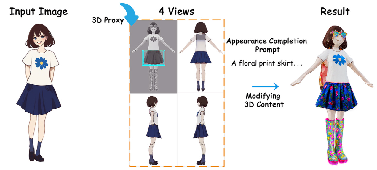We present an interactive AIGC framework for disentangled 3D character creation, supporting sketch-based clothing transfer and 3D-proxy-guided part editing. Our method leverages geometry-aware 3D Gaussian reconstruction to ensure high-fidelity, editable avatars with fine-grained control. |