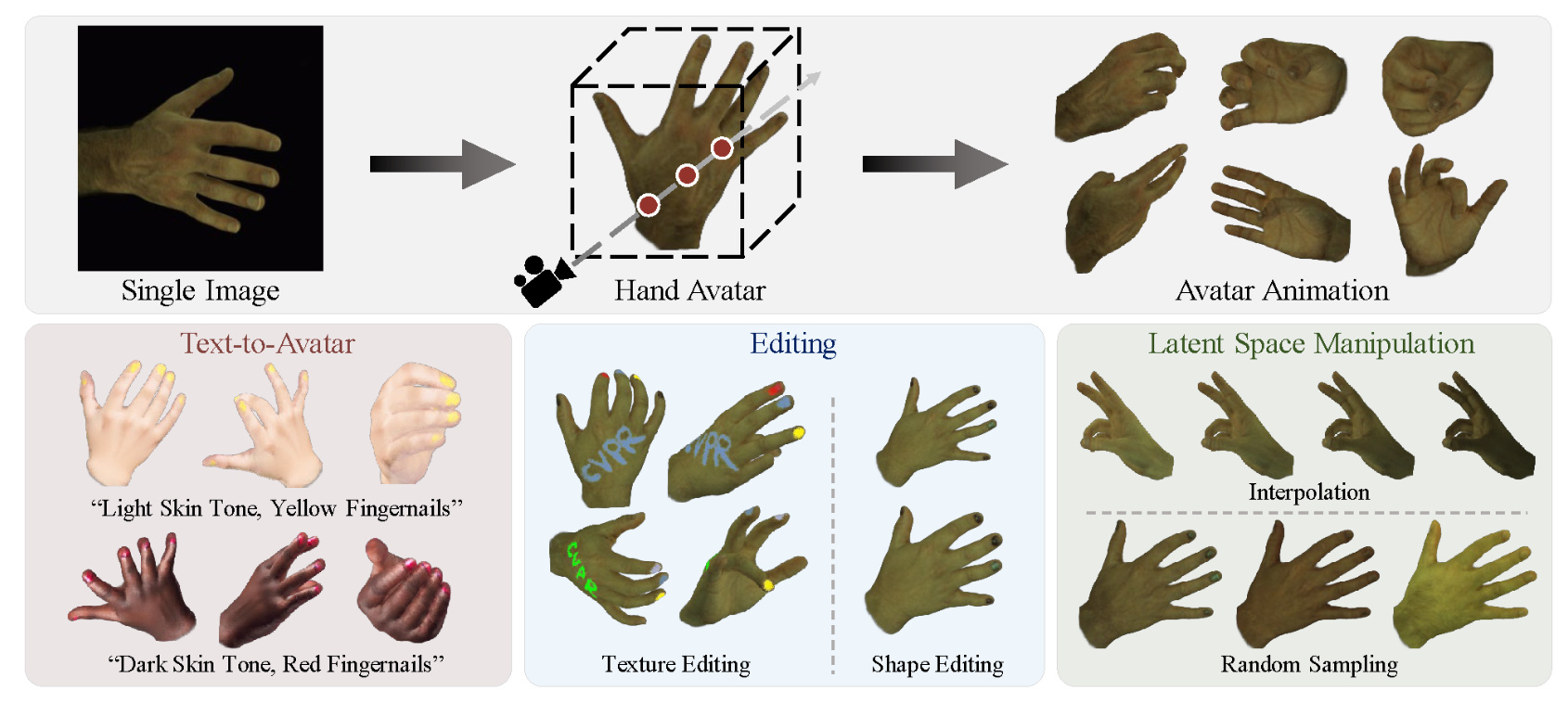 Xiaozheng Zheng, Chao Wen, Zhuo Su, Zeran Xu, Zhaohu Li, Yang Zhao, Zhou Xue CVPR 2024 OHTA is a novel approach capable of creating implicit animatable hand avatars using just a single image. It facilitates 1) text-to-avatar conversion, 2) hand texture and geometry editing, and 3) interpolation and sampling within the latent space. |